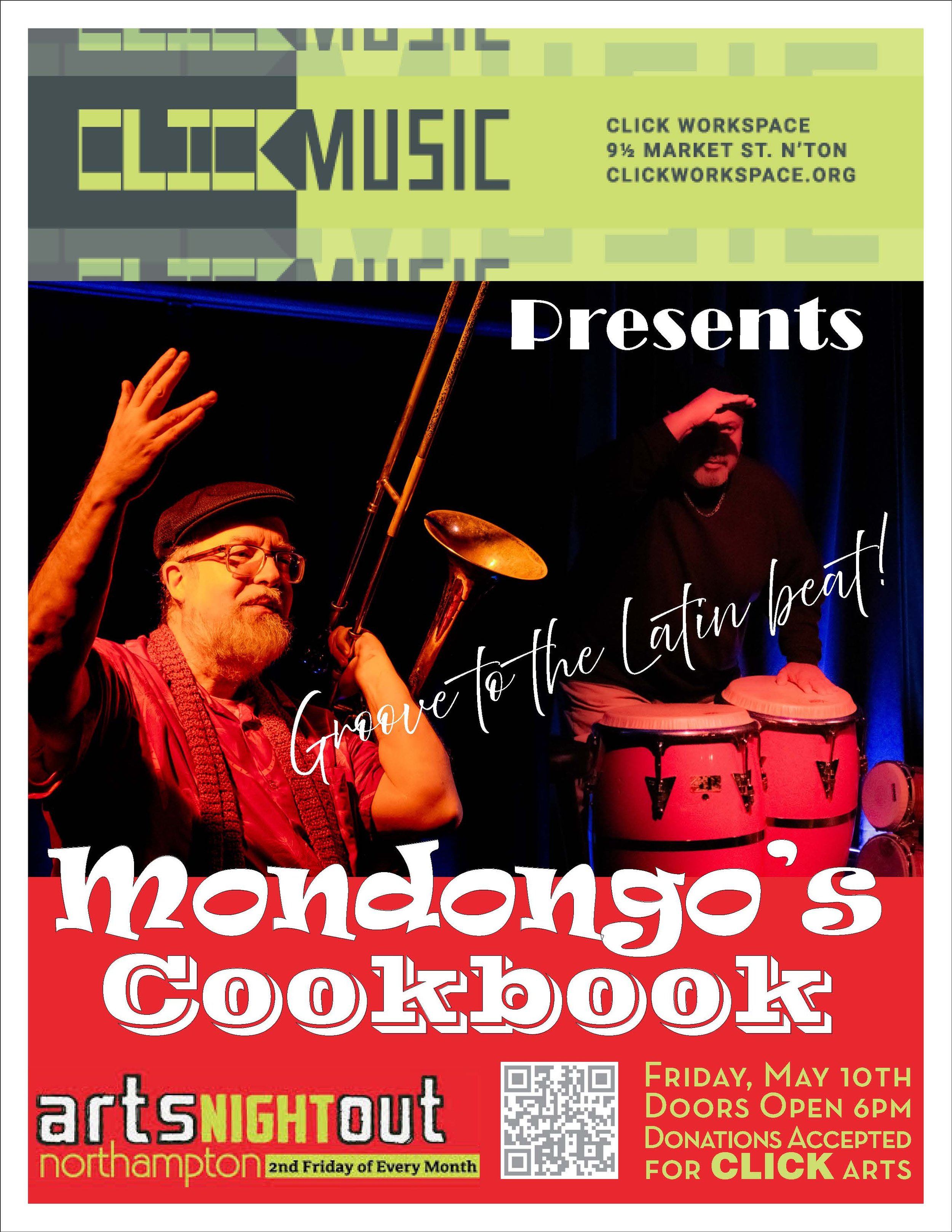 Back to All Events Mondongo's Cookbook Friday, May 10, 2024 6:00 PM 8:00 PM CLICK Workspace 9 1/2 Market Street Northampton, MA, 01060 United States (map) Google Calendar ICS Mondongo's Cookbook features Trombone, Bass and Congas playing dance rhythms of the Caribbean and South America. Groove to the Latin vibe and celebrate the art of Gabriela Sepulveda on view at CLICK.